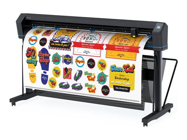 | Förpackningens innehåll | Avskärningskniv, 2 x mediaflänsar, ställ, styrmjukvara för HP Cutter, HP FlexiPrint and Cut RIP, skärare, mediafack, standardhållare, 2 x standardblad |